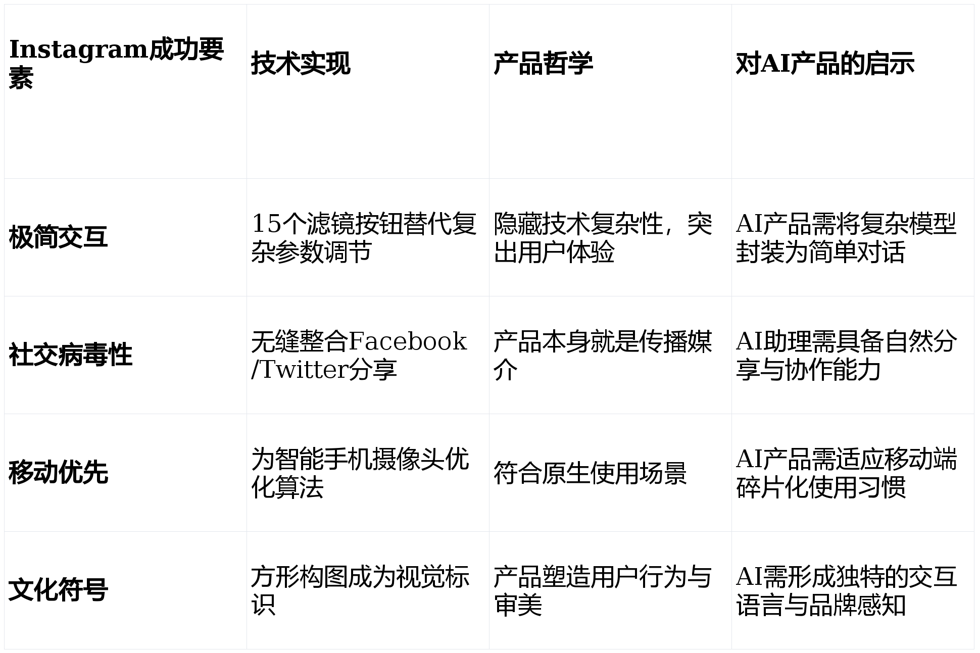 :一键滤镜、方形构图、无缝社交分享。表1:Instagram成功要素与AI产品启示