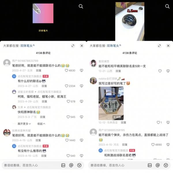 比如有些消费者会根据自己的书写习惯,建议品牌优化笔杆的粗细和材质,也有人建议与知名IP联名,增加一些动漫元素。