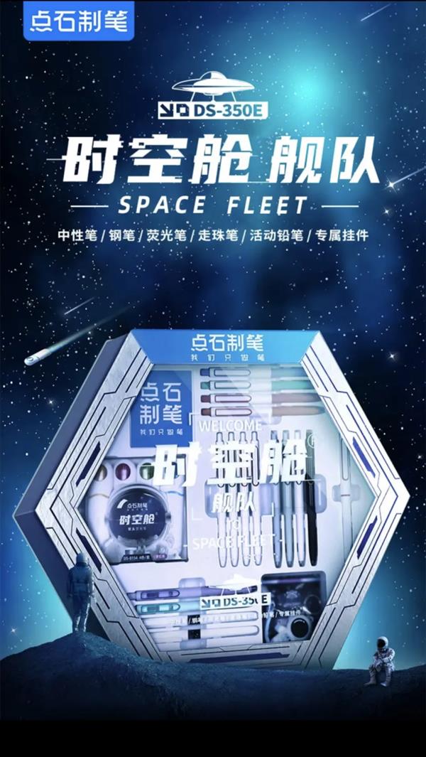 点石曾在抖音电商推出一款接近200元的“时空舱”舰队礼盒,包含中性笔、钢笔、荧光笔、走珠笔、活动铅笔,以及8支笔芯、2只墨囊和1个“时空舱”挂件。刘勇回忆,由于价格相对较高,且市场上类似的礼盒产品竞争激烈,推出这套礼盒时,团队内部也心存疑虑,对销售前景并不乐观,因此只谨慎地准备了 1000 套。