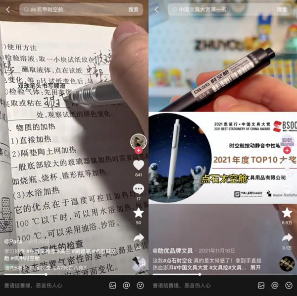 当时,还未入驻抖音电商的点石制笔以达人合作的形式在平台试水,邀请了一批在文具领域有影响力的达人,测评、推广原创新品“时空舱” 系列笔。没想到,“时空舱”一炮而红,跻身文具届爆款行列,断货几乎成为常态。