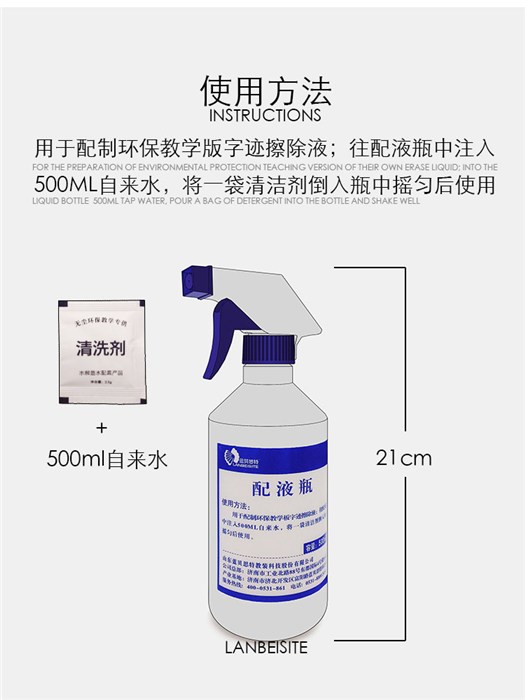 本产品使用方法:用于配制环保教学板字迹擦除液;往配液瓶中注入500ML自来水,将一袋清洁剂倒入瓶中摇匀后使用。 产品规格:一袋3.5克 每盒50袋