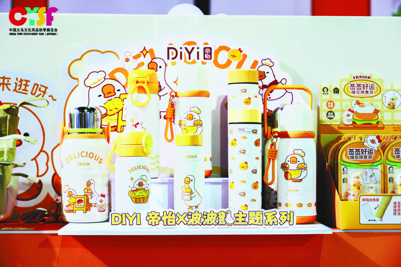 2023年,义乌市文化用品行业协会以义乌诗人骆宾王的《咏鹅》为设计灵感,打造了系列IP核心形象“波波鹅”。这只头顶爱心、扁眼灵动的卡通鹅,凭借萌趣设计火爆出圈,不仅化身中性笔、书包等文具,更通过“IP共享模式”免费开放给200家会员企业使用。“一枚普通文具盒批发价在1到2元,融入‘波波鹅’元素后,单价会升至15至18元。”黄昌潮说,目前相关IP产品远销中东、欧美等地,并与泰国等地签订了IP授权推广的战略合作协议。